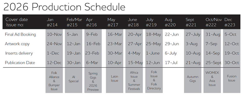 Please either email advertisement artwork to production@songlines.co.uk or upload to a file transfer service of your choice. Your file should be a high resolution (300dpi) PDF, Apple Mac compatible, CMYK format.