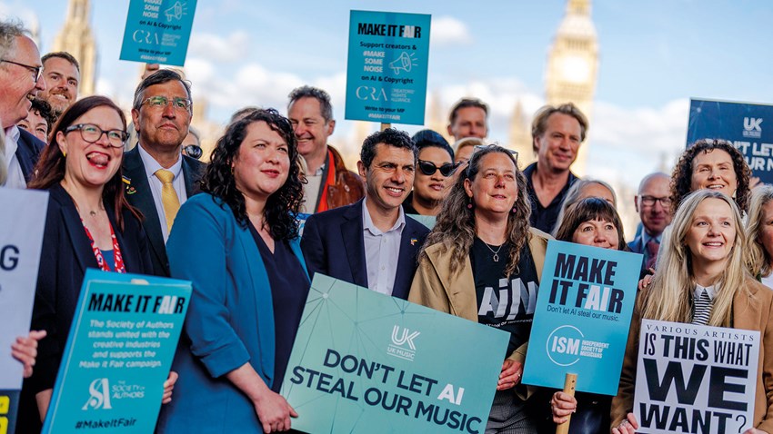 Music creators and politicians, including the Musicians’ Union, protesting the UK government’s handling of AI legislation, May 2025