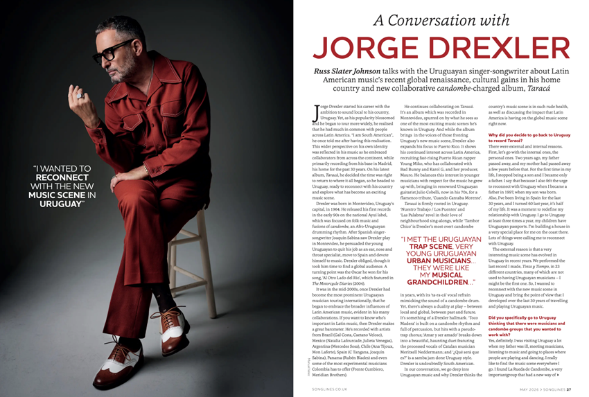 Uruguayan singer-songwriter Jorge Drexler tells us why he decided to return home for his latest album. We find out why Belgian ensemble SONICO are so crazy about tango innovator Eduardo Rovira. Elsewhere, our Beginner's Guide is devoted to Lebanese producer Charif Megarbane, and we celebrate another chapter in the remarkable Yiddish Glory project, which has brought wartime Jewish songs back to life.